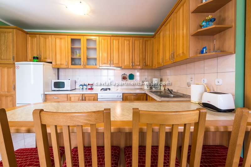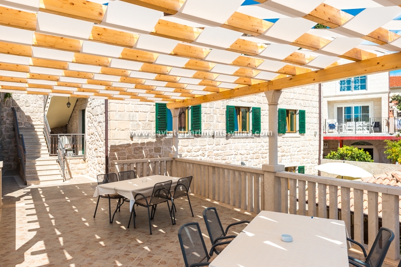 Modern yet traditional in style, both apartments offer guests spacious accommodation and are made up of two separate bedrooms, each with a queen size bed and a big wardrobe, a bathroom features shower and washing machine, an open plan fully equipped kitchen/diner/lounge area with a double sofa bed capacity for 2 people. The living area and one of the bedrooms have sea facing windows. Further there is a huge shared terrace overlooking the sea and old port, equipped with a deck chairs and a comfortable garden furniture for outdoor dining and chilling out. The terrace can be totally private if booked whole property at once (see details of villa CT-V08). Air conditioning, sat TV and free WiFi are provided. Apartments are additionally equipped with iron/ironing board and hairdryer. It is convenient for elderly people as for a family or a group of friends while it is situated in a quiet cobbled street just a stones through from the promenade where the restaurants, bars, shops, banks, post office and beaches are. The most beautiful pebble beach suitable for children is less then 5 minutes easy walk from the apartment. There are two apartments on the upper floors and one on the first floor. Please see the first floor apartment details @ CT-A23  |