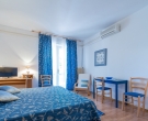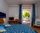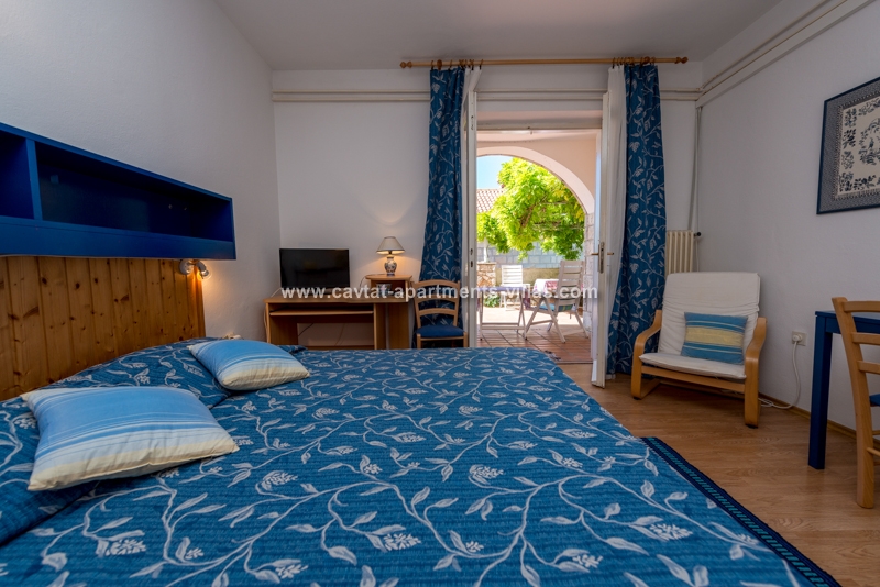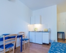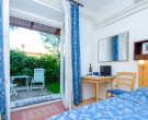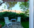 This apartment on the ground floor is composed of a bedroom with two beds, a shower room and a fully equipped kitchenette (fridge/kettle/toaster/coffee machine)attached to the room. The apartment has an access to the patio with a partly sea view or a garden area both with garden furniture for outdoor dining. Air conditioning, sat TV, telephone and safe are provided. This type of apartment is recommended to couples and groups who wants to stay in comfortable and economical accommodation. There is a possibility to have private terrace or garden for your own use if you book minimum two apartments. For further information please contact us by e-mail or phone. There are 4 studios this type at the property.