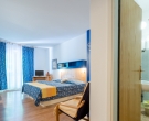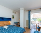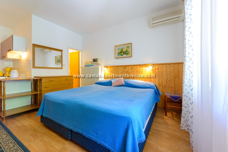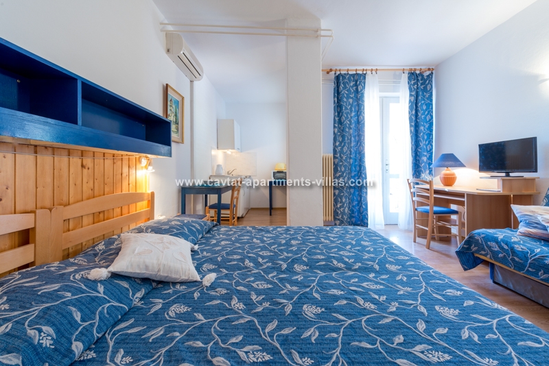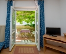 This apartment is on the ground floor with access to terrace or garden with table and chairs for outdoor dining. It consists of a bedroom with two beds + additional fold out sofa capacity for extra person, a shower room or bathroom and a fully equipped kitchenette (fridge/kettle/toaster/coffee machine). Air conditioning, sat TV, telephone and safe are provided. This type of apartment is recommended to couples and groups who wants to stay in comfortable and budget accommodation. There is a possibility to have private terrace or garden for your own use if you book minimum two apartments. For further information please contact us by e-mail or phone. There are 4 studios this type at the property.