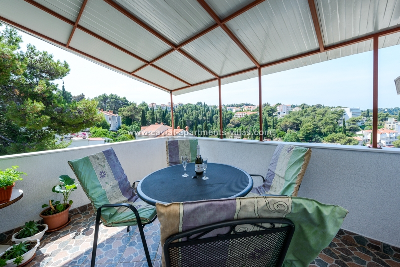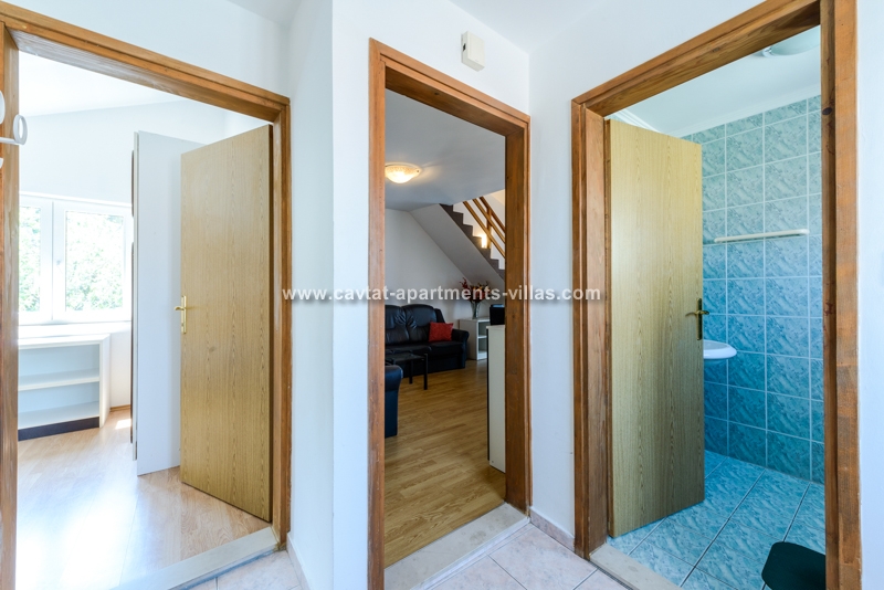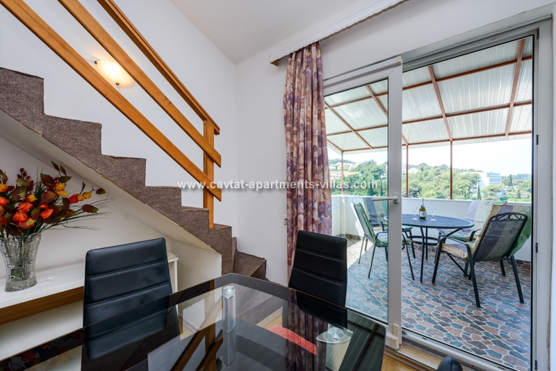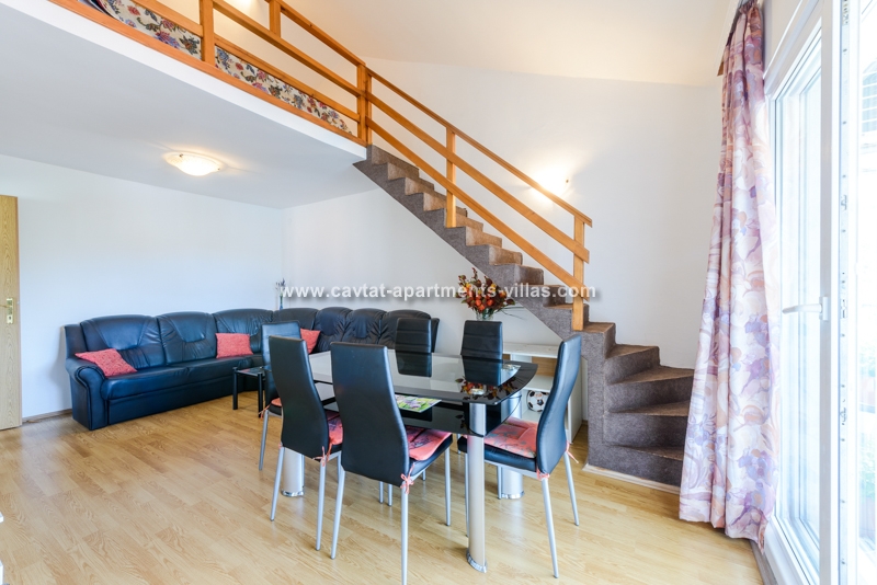 The access to the apartment is via the external staircase between the two apartment blocks. The apartment is located on the top floor and consists of two double bedrooms, a shower room and a lovely diner/lounge area with partially separated kitchen both having the access to the roof top terrace with great views over the bay and Cavtat Old town. From diner/lounge there is are stairs going up to the gallery where is an extra separate toilet. The apartment has free WiFi internet connection. There is a street parking in the rear of the property. The apartment owner lives within the property, directly underneath the apartment. This apartment would suit a family or small group holidaying together looking for a vicinity of beaches and all important amenities. The apartment would not suit people with walking difficulties. This apartment is located within the same property as apartment CT-A65  |
