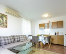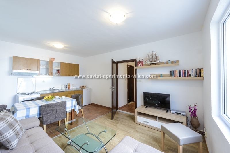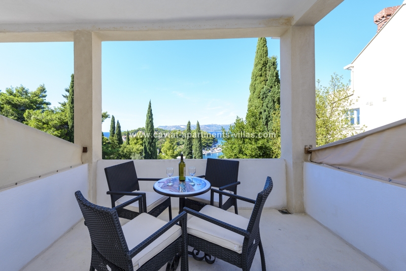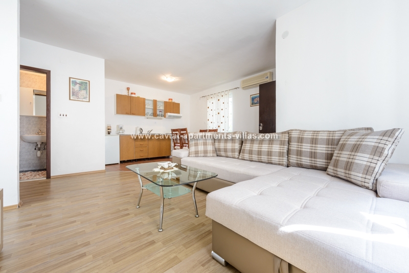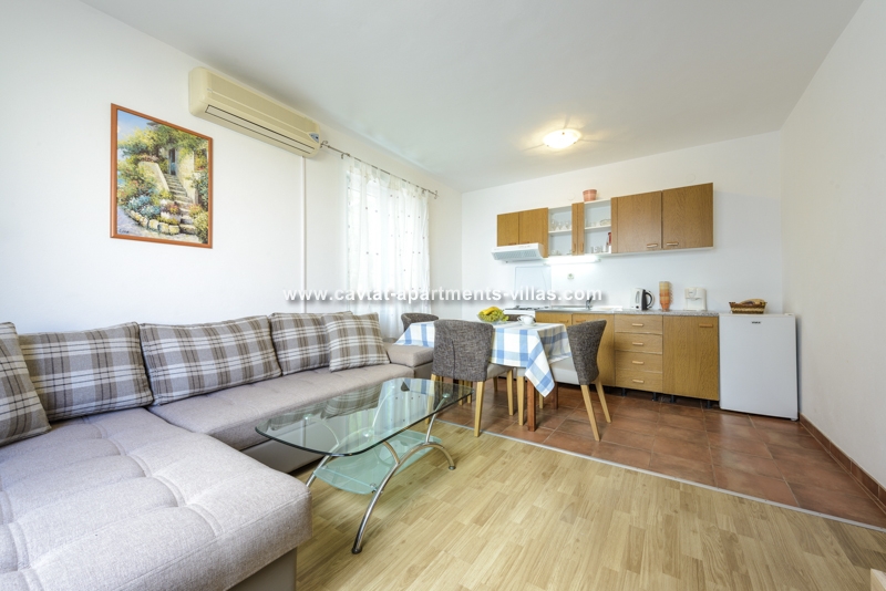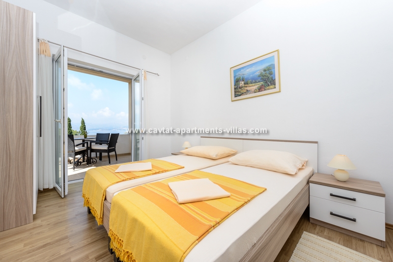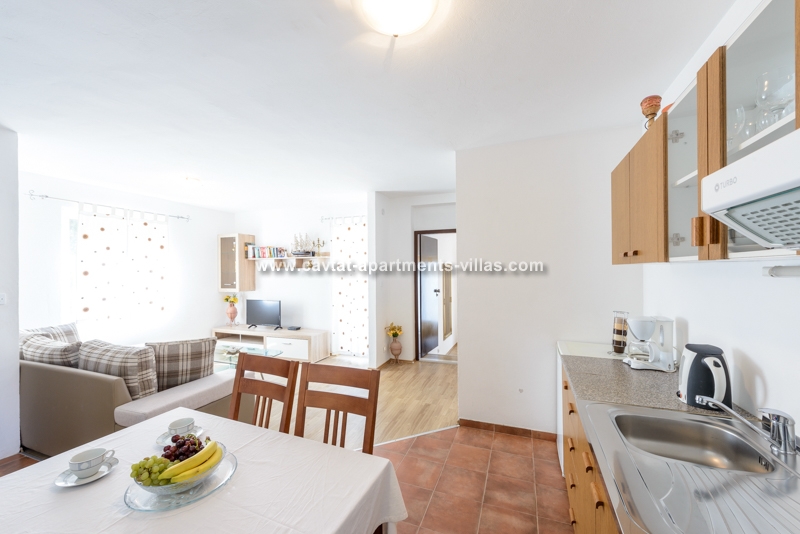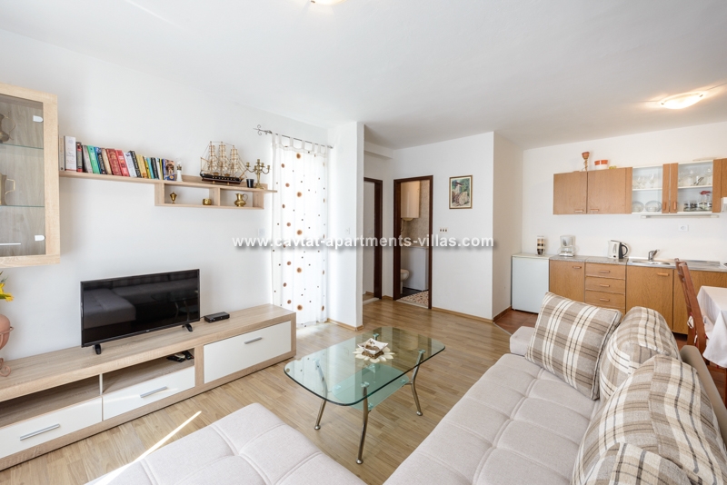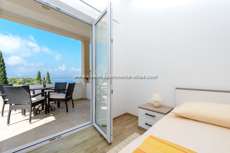Situated on the 1st floor, the apartment makes a part of a private house and consists of a separate bedroom with two beds, a living area with a sofa which can be used as an extra sleeping place for one adult or two children with a fully equipped kitchen/diner area and a shower room. A door from the bedroom leads out onto a lovely sea view terrace with outdoor furniture. The views from the terrace are breathtaking overlooking the bay of Tiha and Old town. The apartment is air conditioned and features a sat TV, WiFi internet connection, a hairdryer and a washing machine. Iron/ironing board can be supplied upon request. If you are a family or a couple this is an ideal apartment for your holiday. You will enjoy in wonderful views over the area while staying within walking distance to all local amenities. As there are four 1-bedroom apartments to let available at this property (2 on the 1st floor and 2 on the 2nd floor) this accommodation would be suitable for more families/couples traveling together. These two apartments are located in the same house as apartments CT-A54 (2 units)  |