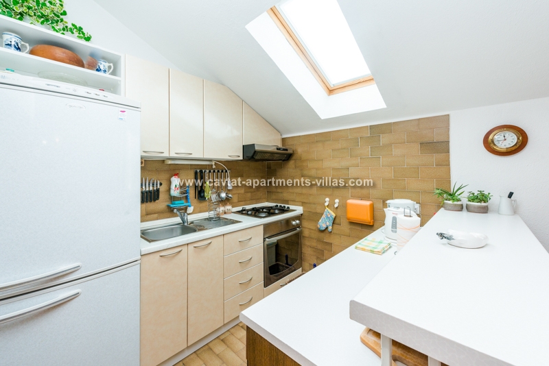 The apartment is located on the top floor and entered from the rare where there is a street parking. An external staircase leads to the apartment. The apartment consists of a hallway, a shower room, two bedrooms rooms (both with double beds), a fully equipped kitchen/diner/lounge area and a balcony with stunning sea views. The apartment is air conditioned and equipped with washing machine, sat TV and CD-player. Free WiFi internet is provided. A hairdryer and an iron/ironing board are provided too. We highly recommend this apartment because it's located within 10 minutes walk of the town center and restaurants and just a few minutes walk of the main beach suitable for small children. This apartment is located within the same property as apartments CT-A47  | CT-A104  | CT-A105  | CT-A106  |