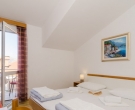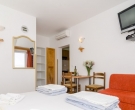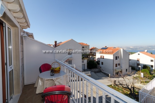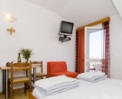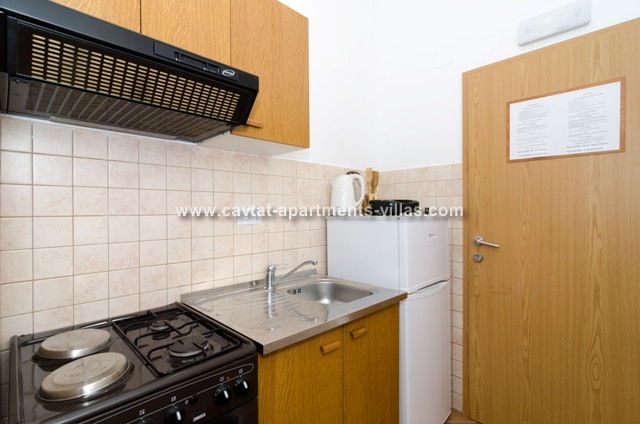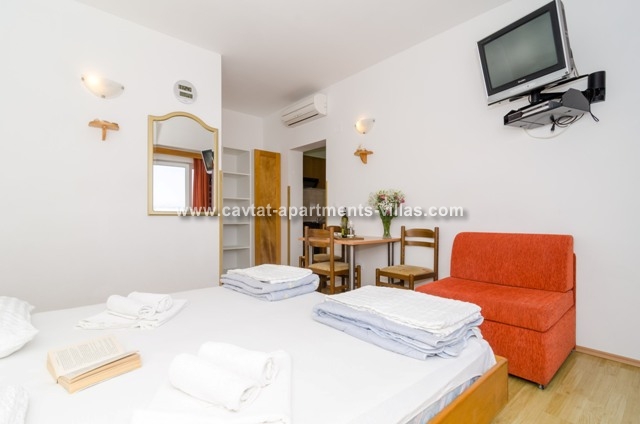 The apartment is situate on a top floor of a family-run house on the small slope above the town center. This studio consists of a double bedroom with sofa bed as an extra sleeping place for one person with fully equipped kitchen as extension, a shower room and a balcony overlooking the sea. Fully air-conditioned it is equipped with sat TV and Internet connection. There is a private parking place in front of the house. The apartment represents excellent value for money and is a great for couples or families looking for an ideal base for exploring the regional treasures while being in vicinity of a restaurants, shops, beaches and entertainment. This apartment would not suite dose with walking difficulties. This apartment is located in the same house as CT-A70  | CT-A28  |