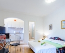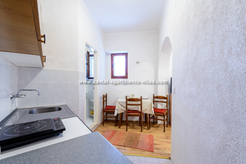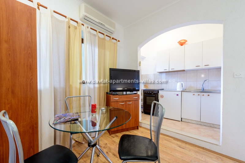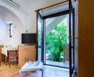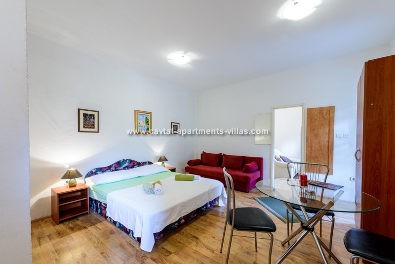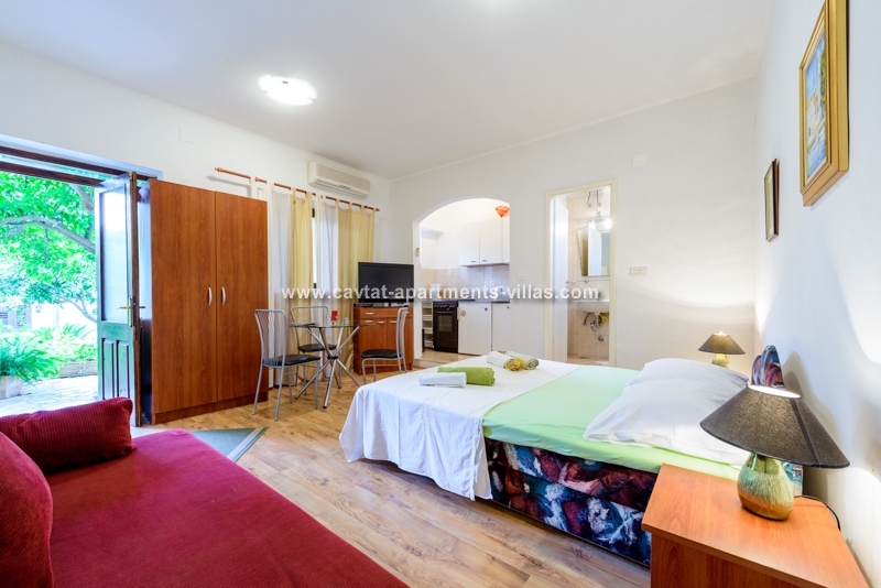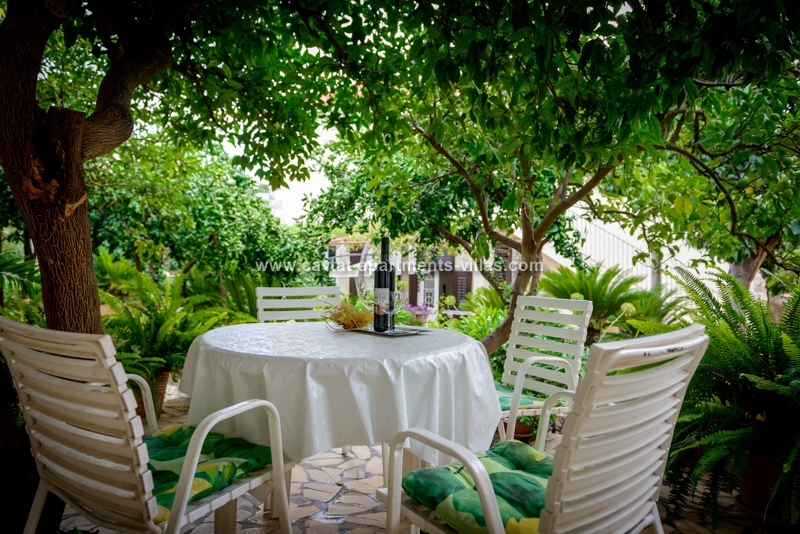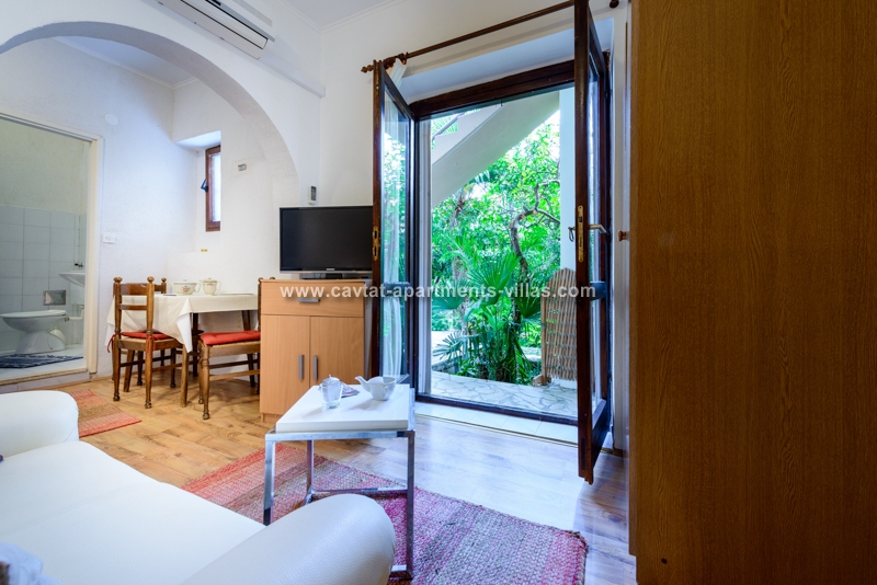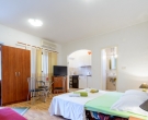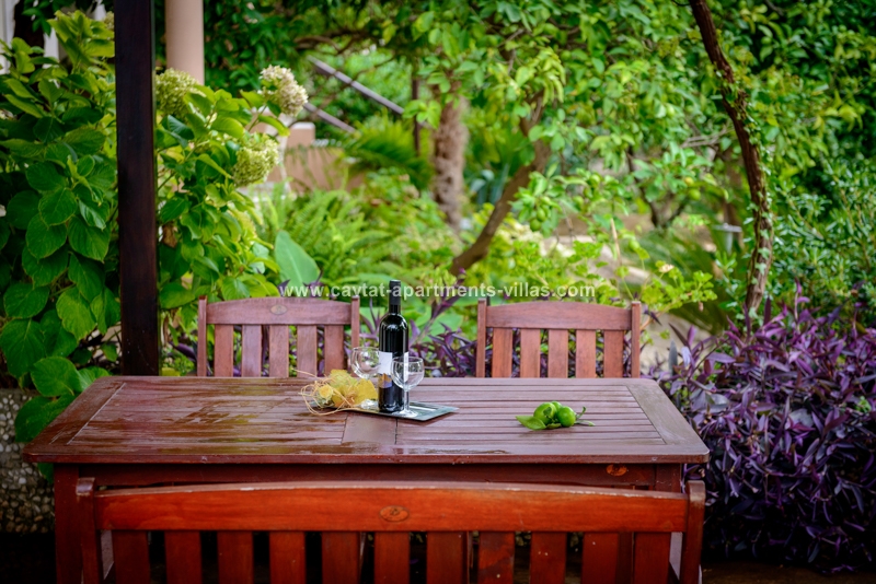 The apartment is situated on the ground floor and overlooking lovely garden with Mediterranean vegetation, offering guests a truly rest in a peaceful area. The apartment is recently renovated and consists of an open plan double bedroom with sofa bed which can be used as extra sleeping place for two children or one adult person/kitchen/diner area, a shower room, a separate bedroom with kitchenette/lounge/diner area and a patio with facilities for outdoor dining. Sat TV and Air conditioning are provided, as well as a shared loundry and BBQ in the small storage by the apartment. The apartment for up to five people is perfect for two couples, a family with kids, or more families traveling together, as there are five more accommodation units within the property. The relaxing atmosphere of this spot is ideal for those looking for peace and beach vicinity. This apartment is located within the same property as CT-A15  | CT-A58  | CT-A63  | CT-A88  |