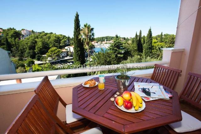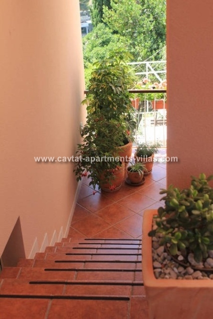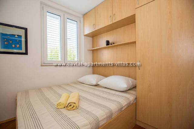 The apartment is located on the 2nd floor and entered from the rare where there is a street parking. An external staircase leads to the apartment. The apartment consists of two double bedrooms, a shower room, a kitchen/diner/lounge area with a fold-out sofa that can be used as extra sleeping place for one person and a balcony that is suitable for outdoor dining offering sea view over the Tiha bay. The apartment is air conditioned and additionally equipped with a washing machine and a sat TV. Free Wifi internet connection is provided. We would definitely recommend this apartment because it's located in a quiet and green area, about 10 minutes' walk of the town center and restaurants and just 2 minutes' of the main beach. This apartment would not suit those with walking difficulties. The apartment is located within the same property as apartments CT-A65  | CT-A104  | CT-A106  |