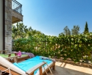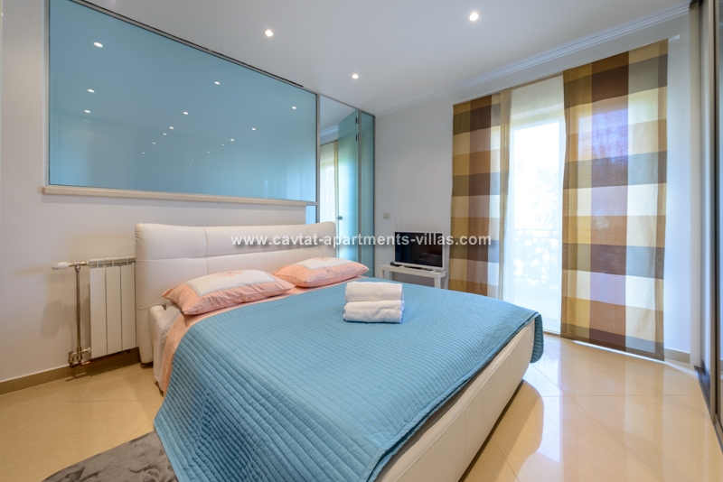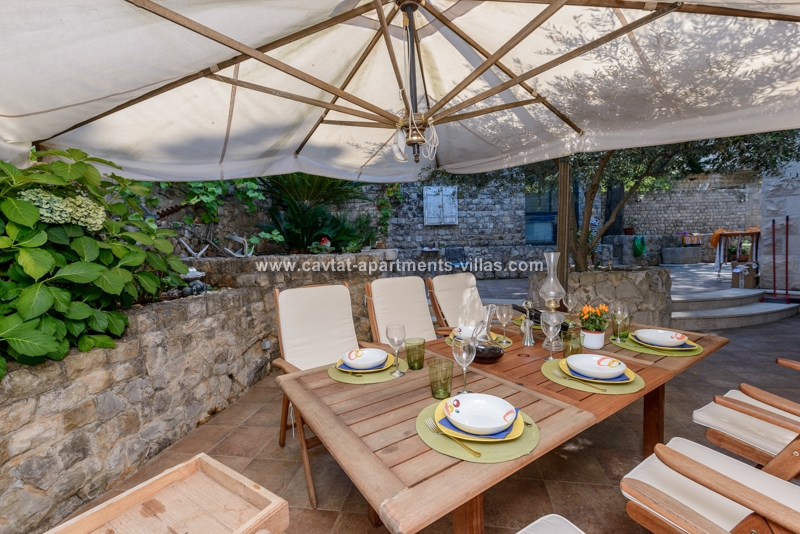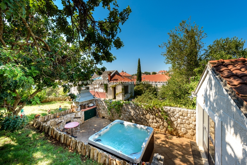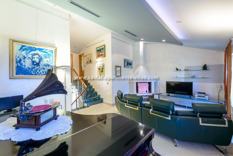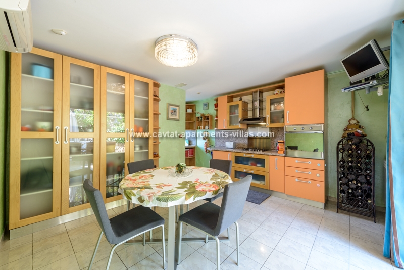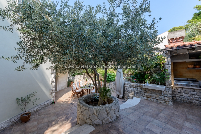 Unique property for its exclusive position, the villa is located in the center of town with breathtaking views and is surrounded with its own garden. The villa is just a few minutes walk to all popular shopping, restaurants, palm lined promenade, food market, banks, post office, bakery and grocery shop. In addition to that, the proximity of the villa to the public transportation (boat and bus) makes it easy to explore Dubrovnik and the beautiful Konavle region. This luxurious and elegant three story villa combines all of the modern comforts and luxuries such as central air and heating (each room with its independent climate control), a spacious living room includes a comfortable couch positioned in front of a flat screen TV. The separate eat-in kitchen is fully equipped including dishwasher and microwave oven and a dining table for 6 people with access to good size patio with table and chairs suitable for outdoor dining. The villa has three bathrooms, one with the bathtub and the other two with shower. On the ground floor there is a spacious double bedroom with a king size bed and a bathroom with shower. A staircase leads to the upper floor to a corridor leading to a separate kitchen/diner area and a large open plan living room with access to a sea view balcony. Another staircase leads to the third level, comprising the third bathroom and two bedroom (one with a queen size bed and the other with two separate beds). The corridor on the lower floor leads to a furnished external terrace equipped with table, chairs, sun beds and parasol. Beside the terrace there is a garden patio with a hot tub, and a summer kitchen with a BBQ. Free WiFi is available in the entire villa. There is a garage parking provided for two cars. The villa is located in the immediate vicinity to Cavtat's beaches, restaurants and sites, and would be suitable for a large family or two smaller families traveling together. This Villa is located on the same propertry as: CT-A10  |