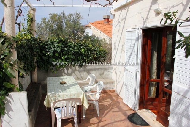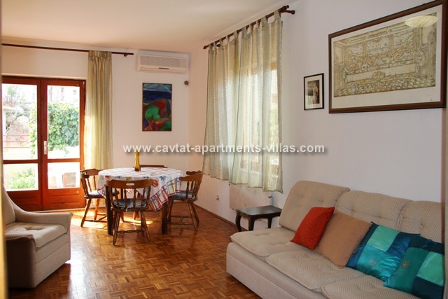 The apartment is located on the 1st floor and it consists of a large air conditioned living room from where you can access the terrace in the lovely garden that offers a nice shade. The spacious living room has a sofa that can be used as an extra sleeping place for two people and a Sat TV, with dining area that has a table and four chairs and a fully equipped kitchen with a refrigerator, a dish washer, an oven and a kettle .The bedroom next to the living room has two single beds and a balcony with comfortable outdoor furniture and a nice view of the mountains and sea in the distance. Private shower room has a fan and towels for you to use. The house has a private parking in front of the house for you to use, as well as free WiFi. There is a playground for kids nearby, and the supermarket is only 3 min of walk away. The apartment is located in a quiet area about 15 min walking distance to the town center and beaches. The bus station is about 4 min walk away if you don't feel like walking to the center or back to the apartment, or if you want to take the bus to Dubrovnik. Perfect for a couple or a family with a child looking to relax in a quiet and comfortable place, that is not too far from the town. This apartment is located within the same property as apartments CT-A115  | CT-A118  |