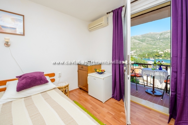 This air conditioned room is located on the 2nd floor of a family run guesthouse and has two single beds, a flat screen TV, a fridge and private en-suite shower room. The room has a furnished balcony offering lovely views of Tiha Bay and the marina. Guests have access to free WiFi, Sat TV, and private parking in front of the house. This room would suite a couple wanting to stay in a quiet area but very close to the town, with everything needed just a short walking distance away. This room is located within the same guesthouse as apartments CT-A119  | CT-A120  |