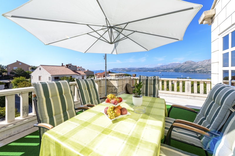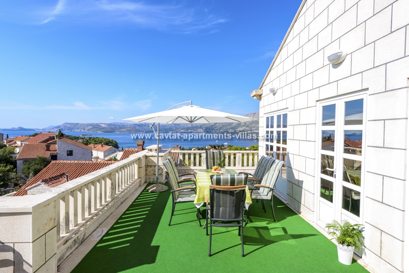 The apartment consists of 3 separate bedrooms (each with a double bed), a living room with a double sofa bed, a fully equipped kitchen/diner area, 2 shower rooms, a bathroom, an indoor BBQ, a huge sea view terrace of 60 m2 and two sea view balconies. The apartment is tastefully decorated and has a magnificent view spreading over the sea, small islands and great part of Dubrovnik Riviera. It is situated on the top floor, fully air conditioned and equipped with free WiFi, a sat TV, a washing machine, a dishwasher, a hairdryer and an iron/ironing board. A wonderful old quarter is situated a short walk away down the hill where are all important facilities such as restaurants, shops, beaches, banks, post etc. Private parking lot is provided in front of the house. This apartment is located in the same house as apartments CT-A09  | CT-A11  | CT-A12  | CT-A38  |