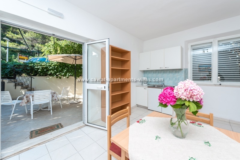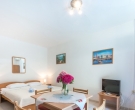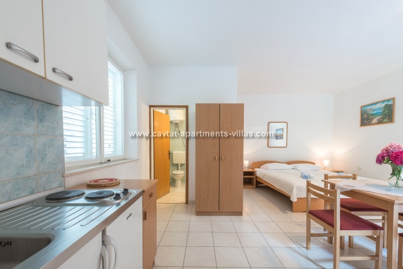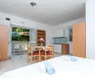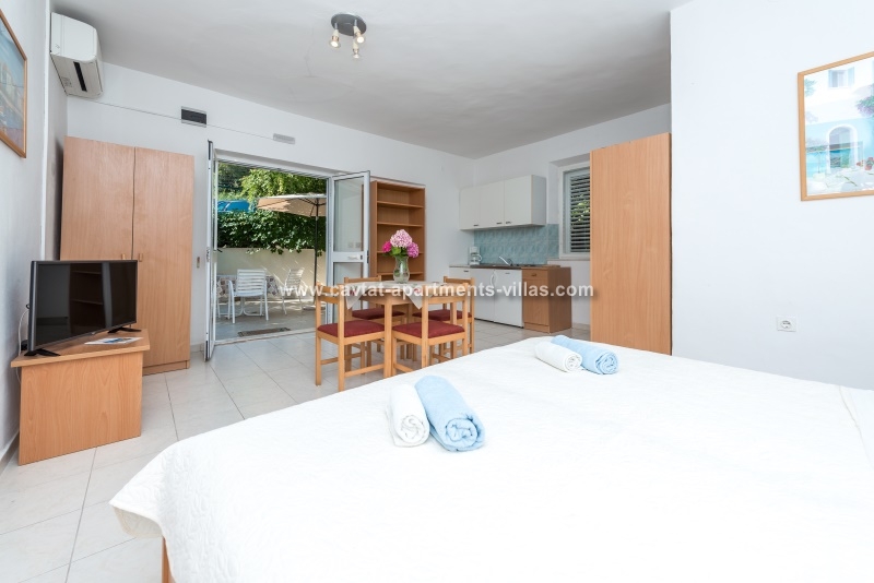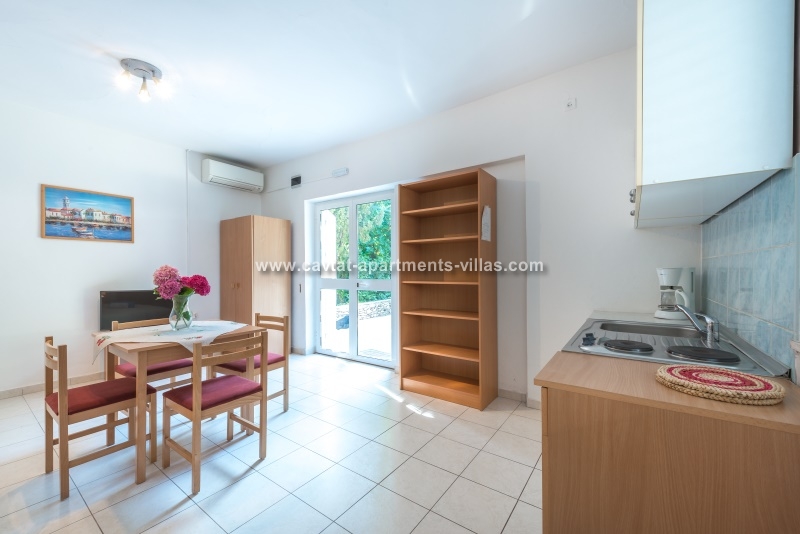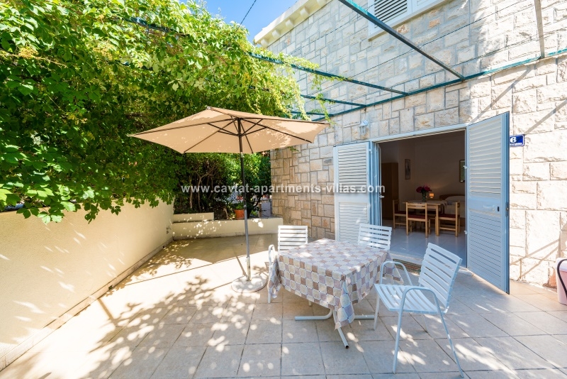 This Studio Apartment is situated within a short walking distance form the old town and all important amenities. The apartment is entered form the large private terrace located just underneath the small road leading to Hotel Croatia. The air conditioned studio is a part of a family owned house and is equipped with 2 single beds that have an option of pulling a truckle bed that can be used as a sleeping place for one child, kitchenette with a fridge, stove top, coffee machine and kettle, dining area equipped for 4 persons and a private shower room. The large terrace features outdoor furniture and the lush vines surrounding the terrace provide privacy and lovey shade during hot summer days.