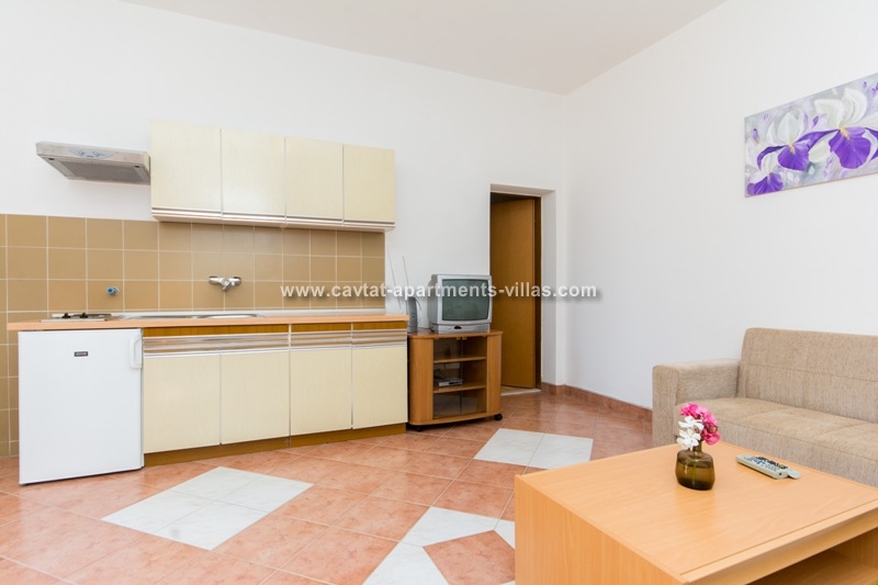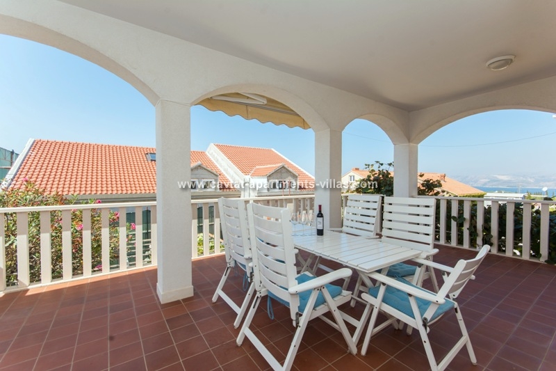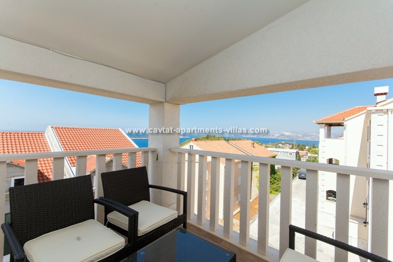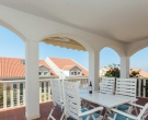 The top floor apartment has three separate bedrooms, two with double beds and one with two single beds. There is also a shower room, a kitchenette, small dining and lounge area with a sofa bed suitable for 2 children. In the corner of kitchen/diner/lounge area there is a shaded outdoor balcony offering stunning sea views.